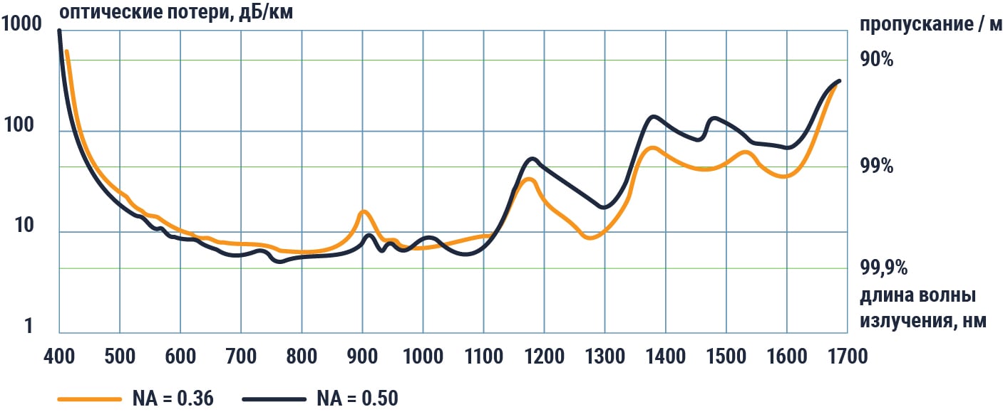 | Operating Wavelength Range, nm | 300-1200 нм (high OH) 400-1700 нм (low OH) | |||