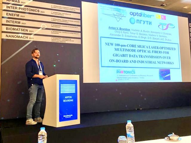 Заместитель генерального директора по научной работе и развитию АО «НПО ГОИ им. С.И. Вавилова» Антон Владимирович Бурдин в рамках приглашенного доклада представил новые кварцевые градиентные оптические волокна с диаметром сердцевины 100 мкм, оптимизированные для совместной работы с когерентными источниками оптического излучения лазерами. Этот новый класс волоконных световодов с экстремально увеличенным диаметром сердцевины и специализированным градиентным профилем показателя преломления позиционируется как решение для мультигигабитных бортовых и промышленных сетей передачи данных разного назначения, отличающихся агрессивными условиями эксплуатации. Впервые продемонстрирована успешная реализация каналов связи, поддерживающих скорости 10 Гбит/с, по изготовленным пилотным длинам указанных 100-мкм оптических волокон протяженностью 300 м, соответственно. Проект инициирован ООО «ОптоФайбер Лаб» (г. Москва, ИЦ Сколково) и реализован в результате межрегиональной коллаборации указанного стартапа с ФГБОУ ВО «Поволжский государственный университет телекоммуникаций и информатики» (г. Самара) и АО «НПО ГОИ им. С.И. Вавилова» (г. Санкт-Петербург), осуществлявших научную поддержку указанной разработки, а также ООО «Канон» (г. Уфа), выступившего в качестве стратегического партнера.