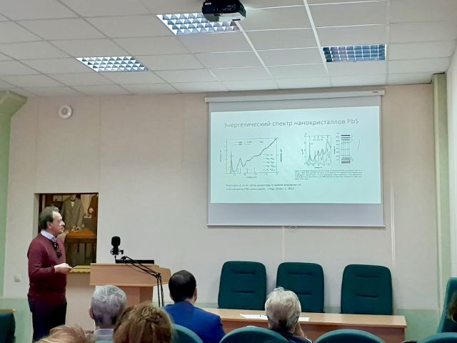 Докладчик начал свою презентацию с рассказа об открытии квантового размерного эффекта, которое состоялось в начале 1980-х годов в ГОИ им. С.И. Вавилова, а также о первой публикации, посвященной этому явлению: Онущенко А.А. Экситонные спектры микрокристаллов CuCl в стеклообразной матрице. Тезисы XIII научно-технической конференции молодых специалистов ГОИ, Ленинград, 1980, с. 313. Итоговая статья Ekimov A.I., Efros Al.L., Onushchenko A.A. Quantum size effect in semiconductor microcrystals. Solid State Communcations, 1985, vol. 85, no. 11, p. 921-924, в которой приводится экспериментальное и теоретическое исследование наблюдаемого явления, цитируется в научной литературе 1670 раз.