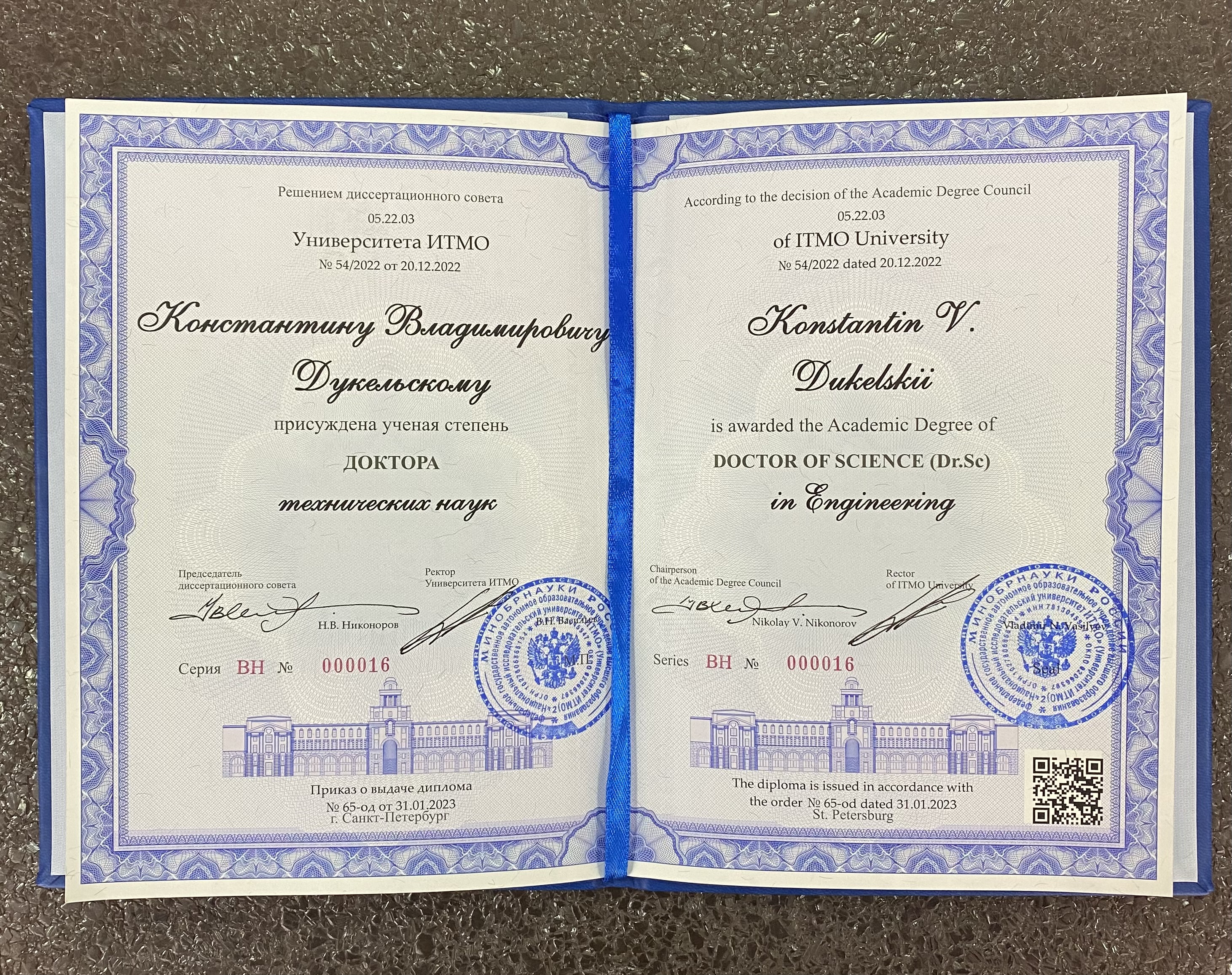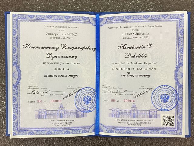 28 февраля 2023 г. прошло заседание Ученого совета Университета ИТМО, в рамках которого состоялось торжественное вручение Диплома доктора наук генеральному директору АО «НПО ГОИ им. С.И. Вавилова» Константину Владимировичу Дукельскому. Диплом вручил Ректор Университета ИТМО, профессор, доктор технических наук Владимир Николаевич Васильев.