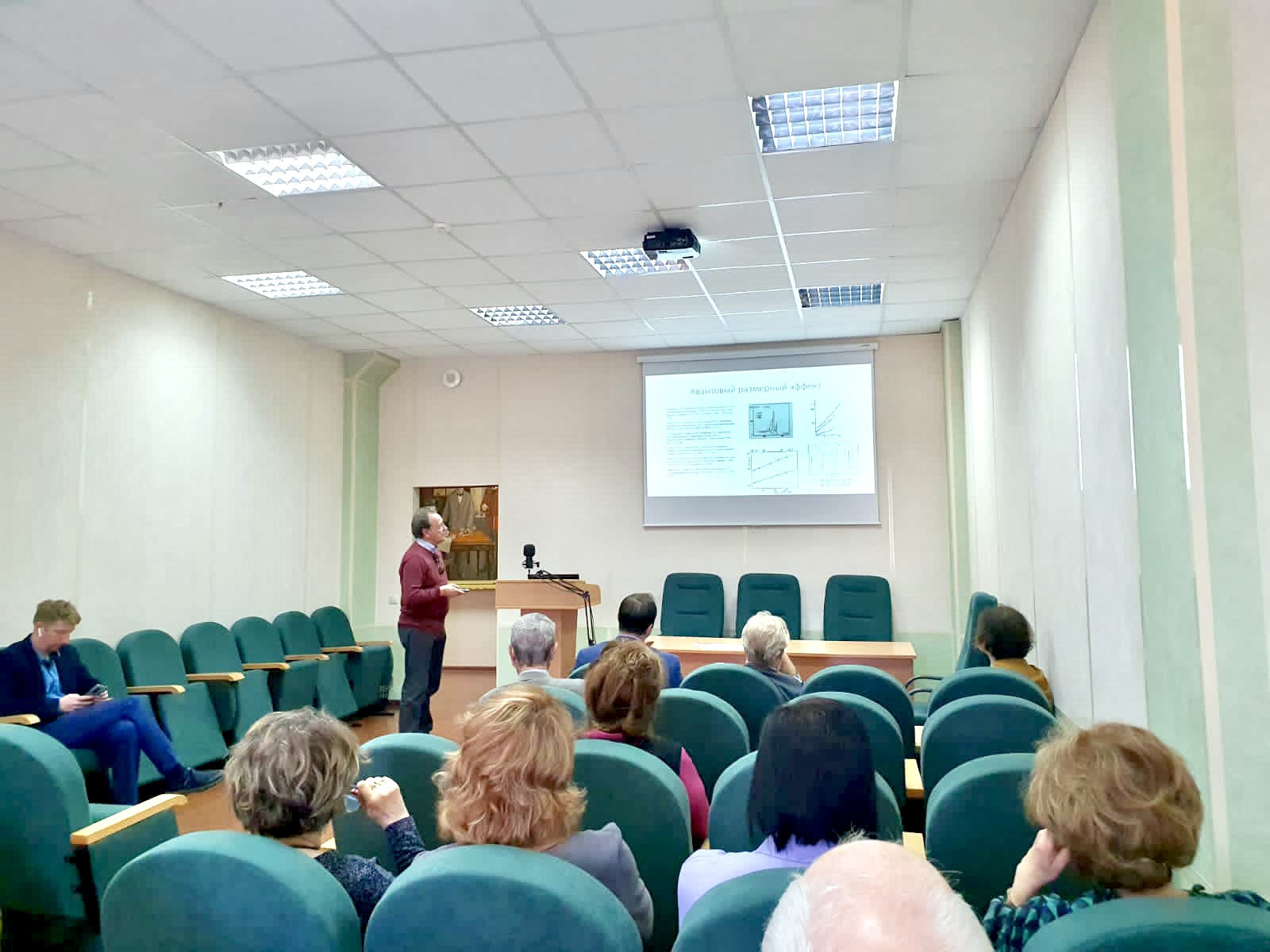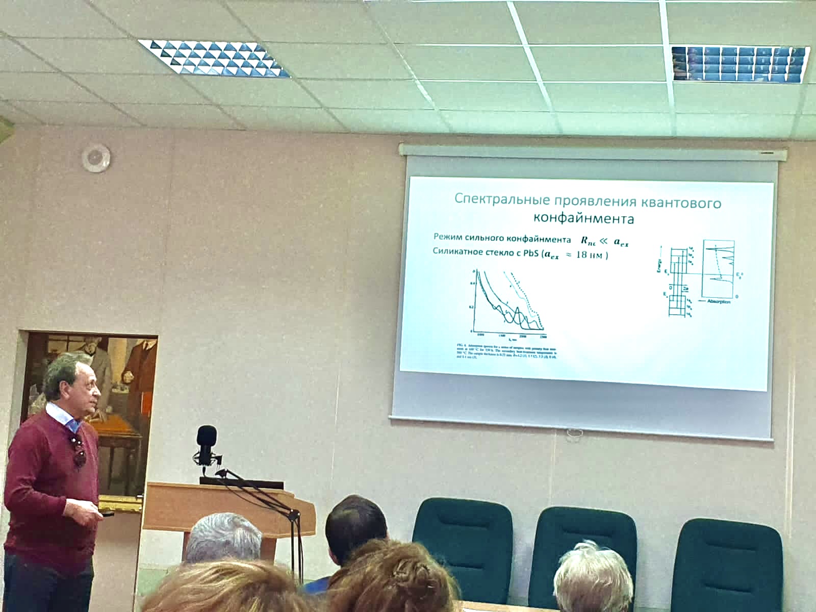 Докладчик начал свою презентацию с рассказа об открытии квантового размерного эффекта, которое состоялось в начале 1980-х годов в ГОИ им. С.И. Вавилова, а также о первой публикации, посвященной этому явлению: Онущенко А.А. Экситонные спектры микрокристаллов CuCl в стеклообразной матрице. Тезисы XIII научно-технической конференции молодых специалистов ГОИ, Ленинград, 1980, с. 313. Итоговая статья Ekimov A.I., Efros Al.L., Onushchenko A.A. Quantum size effect in semiconductor microcrystals. Solid State Communcations, 1985, vol. 85, no. 11, p. 921-924, в которой приводится экспериментальное и теоретическое исследование наблюдаемого явления, цитируется в научной литературе 1670 раз.