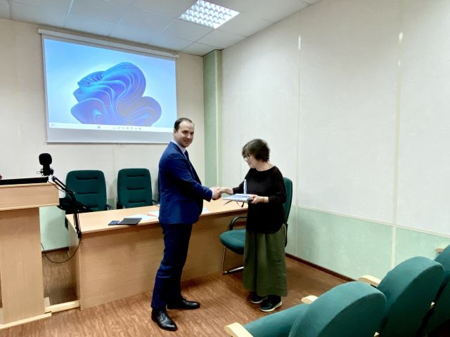 Так же в рамках проведения научно-технического совета состоялось вручение сертификата победителя корпоративного конкурса «ФотоНИКА-2023» в номинации ЛУЧШИЙ НАУЧНЫЙ СОТРУДНИК и памятного знака ведущему научному сотруднику Научного отделения №4 «СТЕКЛО» Дымшиц Ольге Сергеевне.