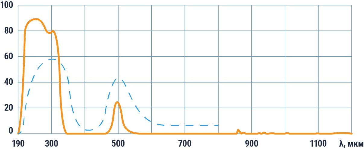 Селективный светофильтр УФ-диапазона для оптико-электронных датчиков, работающих в спектральном диапазоне полного экранирования солнечного излучения озоновым слоем атмосферы (235–285 нм).