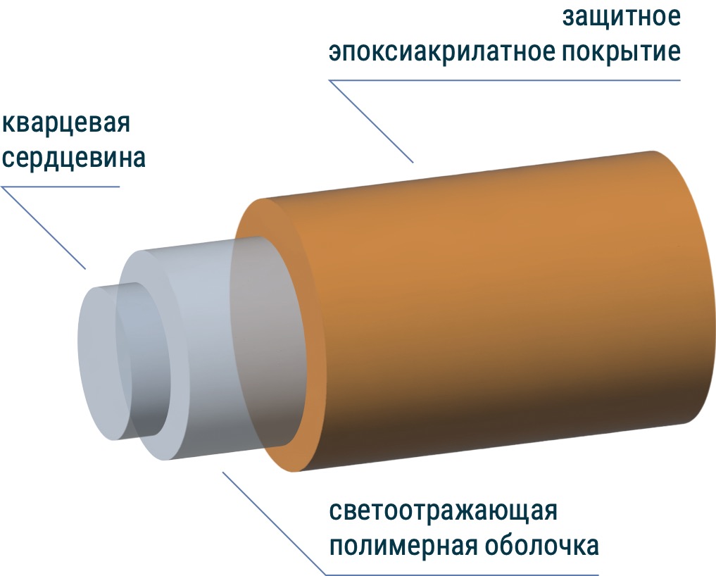 Многомодовое волокно с сердцевиной из нелегированного кварцевого стекла, оболочкой из низкопреломляющего полимера (силикон, фторакрилат) и ступенчатым профилем показателя преломления в однослойном эпоксиакрилатном защитном покрытии. Возможность оконцевания оптическими разъемами типа SC, FC, LC, ST и SMA905.
