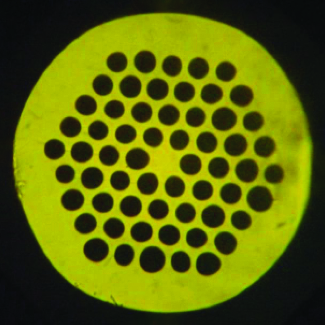 Микроструктурированное оптическое волокно на основе нелегированного кварцевого стекла с гексагональным расположением отверстий в эпоксиакрилатном защитном покрытии, поддерживающее одномодовый режим распространения излучения с почти идеальным качеством выходного излучения в неограниченном спектральном диапазоне.